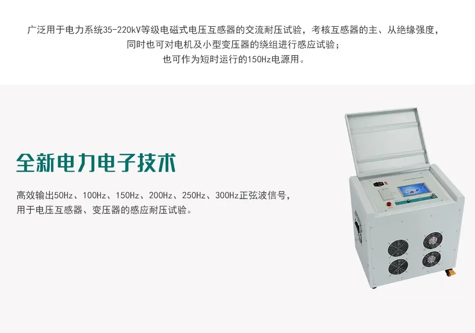 用途:是完成变压器和35-220kV电磁式电压互感器的感应耐压试验!用来考核变压器、互感器的主、纵向绝缘强度,同时也可对电机及小型变压器的绕组进行感应试验。