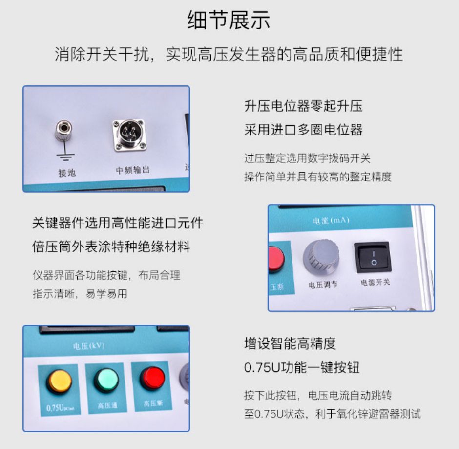 1、直高发采用了新技术、新材料和新器件,具有输出功率大、体积小、重量轻的特点,有可靠的过压、过流及零位合闸保护功能,带0.75倍电压锁存功能,并配有时间继电器,能在试验中设置定时声讯报警。整个仪器便于携带,操作方便,安全可靠,特别适用于电力部门现场试验。